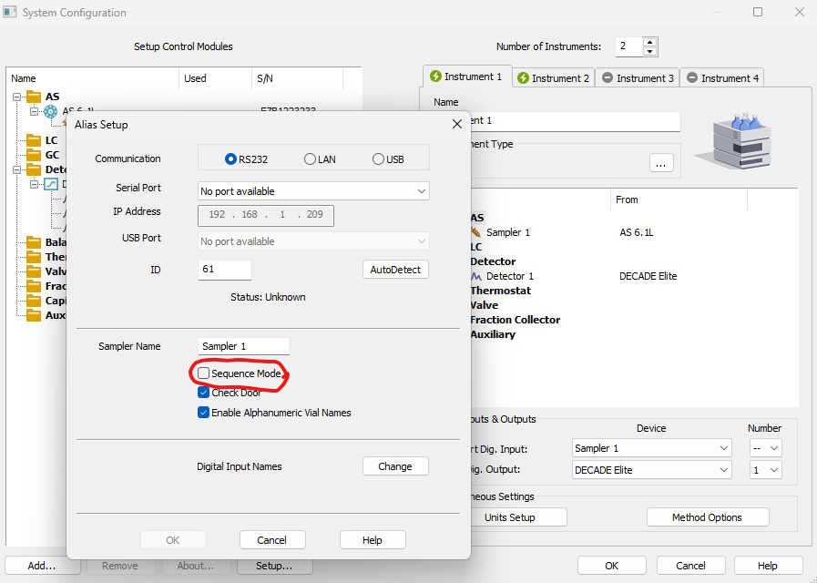 When configuring a system with an AS110 using the ALIAS control module in Clarity always make sure that the sequence mode is not active (it is by default: off). The sequence mode is a special mode of operation in which the autosampler is ‘master’ and can autonomously execute a sequence of runs stored in the AS embedded memory. In that case, it will autonomously inject samples (with a time interval defined by the ‘autosampler runtime’) regardless of the run time programmed in the Clarity method/sample sequence. To avoid this erratic behavior: always have the sequence mode inactive!