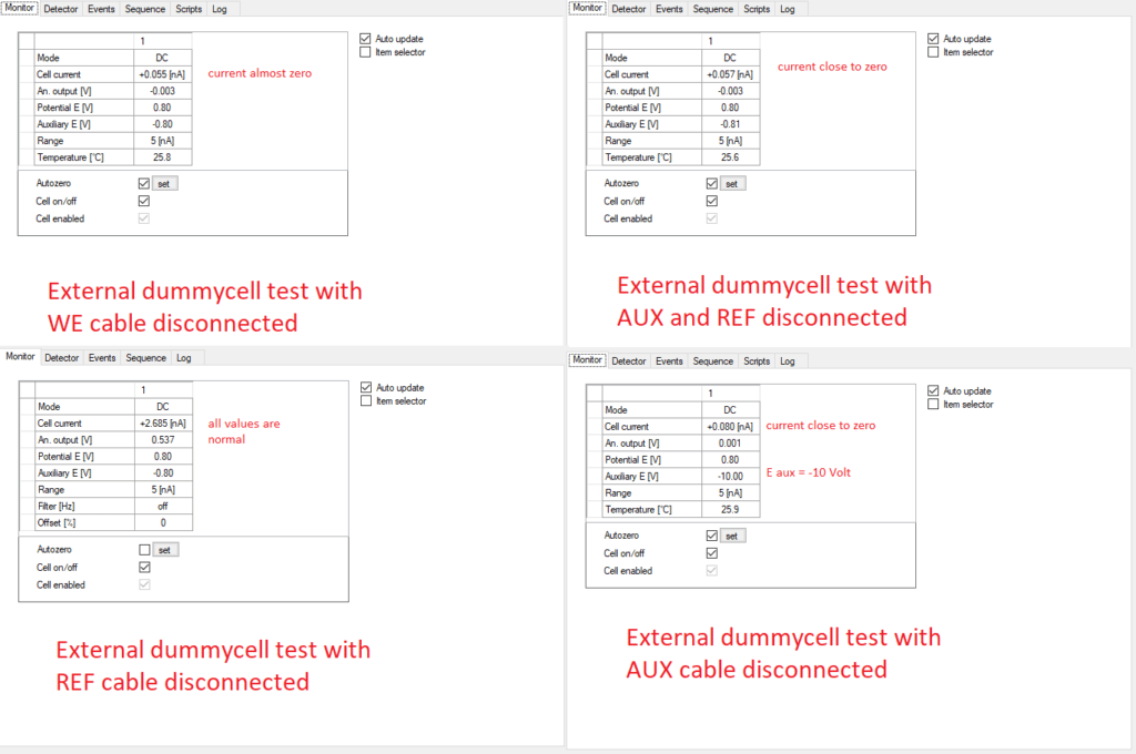 A few examples of a dummy cell test with broken (disconnected) cable: