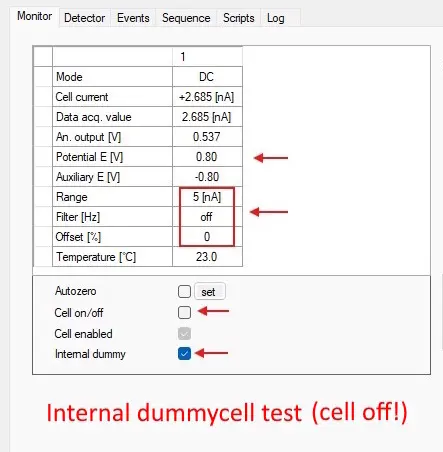 Note that in case the REF cable is not connected, the dummy cell test is passed anyway. This is the only malfunction that is not being diagnosed with a dummy cell test. In case dummy cell test is passed, but still a suspicion that the cable is wrong, the easiest is to replace the cable for a new one. The quickest check is measure resistance with a voltmeter for each wire. The resistance should be (close to zero) zero Ohm. Take one wire of the voltmeter connected to the red pin of the cell cable at one end, and keep the other wire of the voltmeter to pin 1 of the subD connector. The resistance should be (close to) zero Ohm. Repeat for the other wires, pin 1 – 2 – 3 is WE – AUX – REF (red – blue – black). In case the resistance is significantly more than 0 Ohm the wire is internally broken, replace the cell cable.